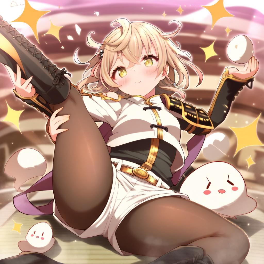 Monoyoshi sadamune, touken ranbu, 1boy, yellow eyes, blonde hair, pantyhose under shorts, lace-up boots, by artist coroha, animagine