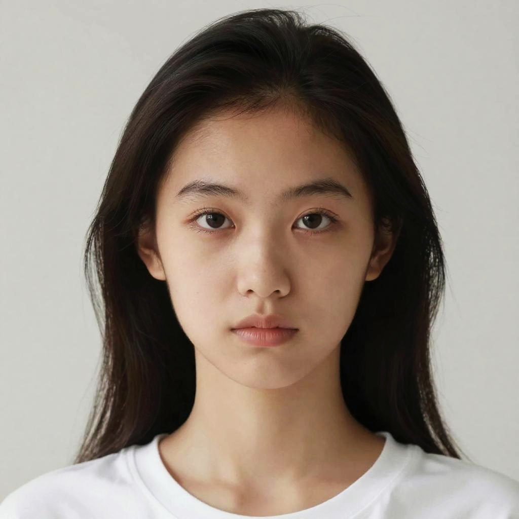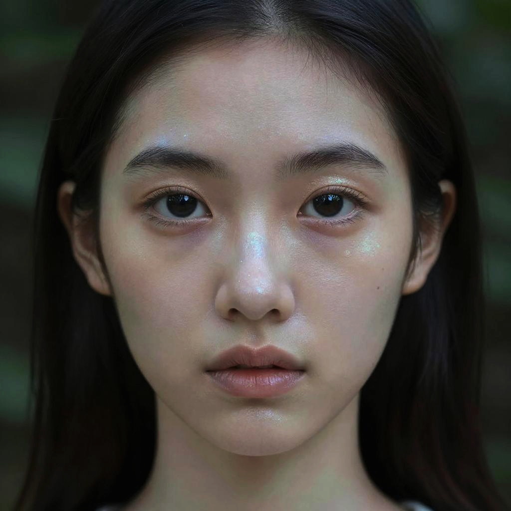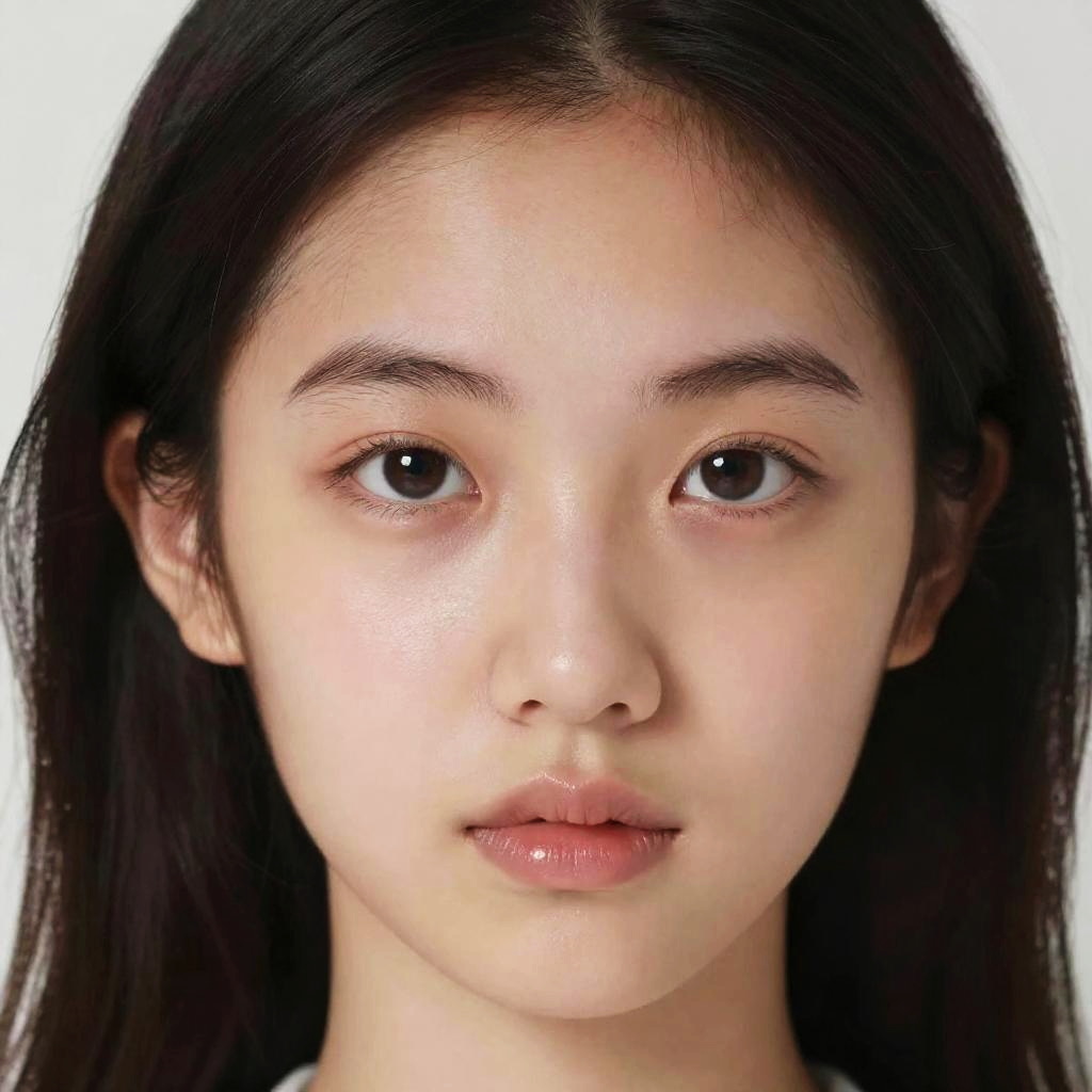 A close-up color photograph of a young Asian woman with smooth glowy skin and natural makeup. She has long dark hair, straight eyebrows, and slightly glossy lips. The image showcases detailed facial features with clear, even lighting on a neutral background.