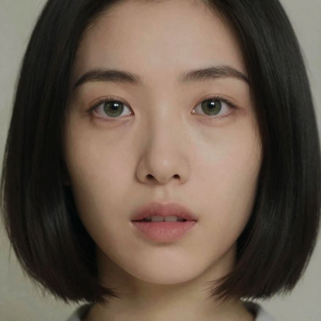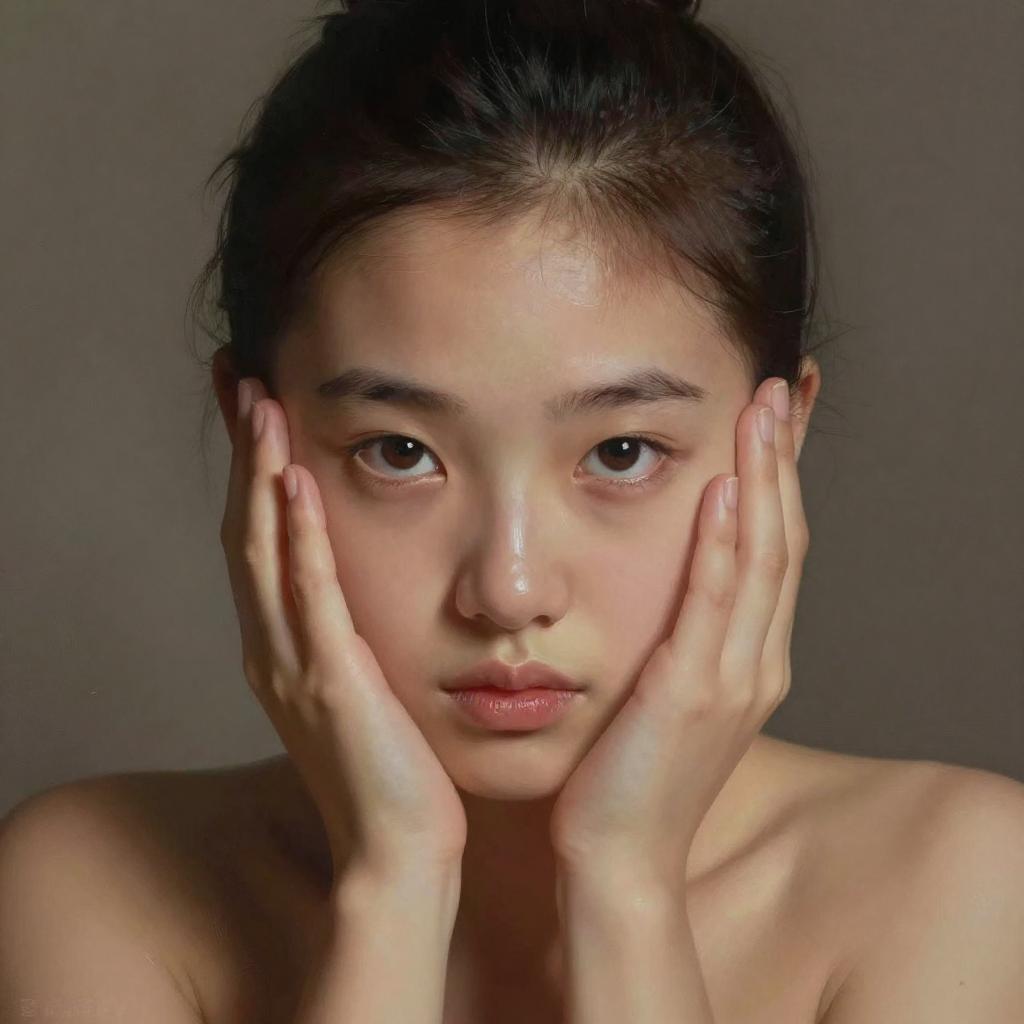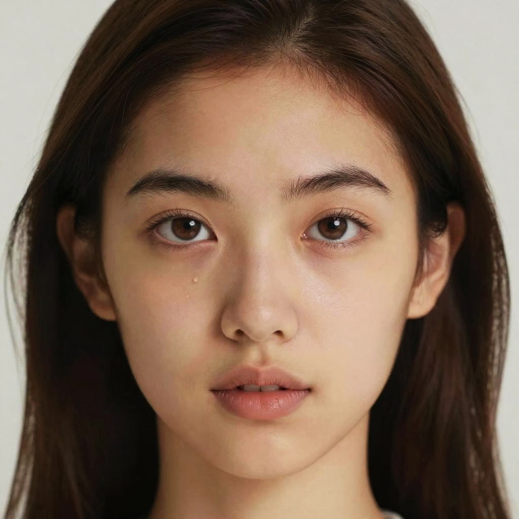 A close-up color photograph of a young Asian woman with smooth glowy skin and natural makeup. She has long dark hair, straight eyebrows, and slightly glossy lips. The image showcases detailed facial features with clear, even lighting on a neutral background.