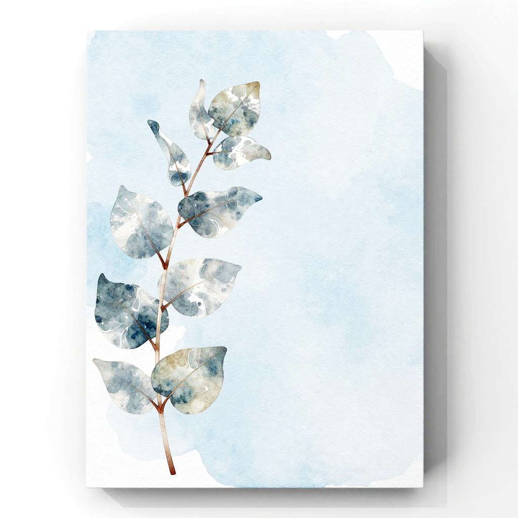This is a digital watercolor painting of a delicate eucalyptus branch. The branch, positioned slightly to the left, features several oval-shaped leaves with subtle gradients of blue, gray, and white, creating a soft, airy texture. The leaves have a translucent quality, allowing some white to show through, and the branch itself is a thin, reddish-brown line. The background is a clean, bright white, which makes the branch and leaves stand out prominently. The overall style is minimalist and modern, with a focus on simplicity and natural beauty. The edges of the painting are slightly shadowed, suggesting it is partially attached to a wall.