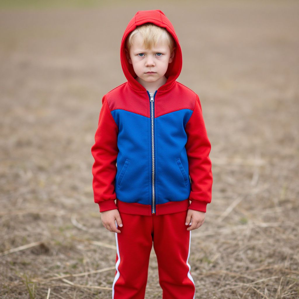 Photograph of a young blonde boy standing in a barren, grassless field. He wears a bright red hooded jacket with blue panels and matching red pants with white stripes. The boy's expression is neutral, with blue eyes and slightly furrowed brows. The background is blurred, showcasing the dry, brown earth of the field. The boy's hands rest by his sides, and the texture of his jacket appears soft and slightly puffy. The overall tone of the image is muted, with the boy's vibrant clothing providing a striking contrast.