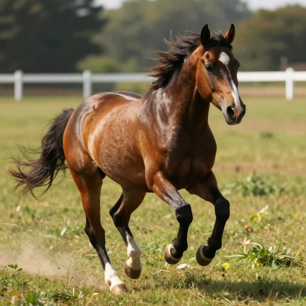 Photograph of a muscular, dark brown horse with a white stripe on its forehead, mid-gallop across a grassy field. The horse's black mane and tail are flowing, and its white socks are visible on its hind legs. The sunlight highlights its shiny, smooth coat. In the background, there is a white wooden fence and a blurred, green forested area. The grass is dotted with small yellow flowers, and dust is kicked up by the horse's movement. The overall scene conveys a sense of freedom and energy.