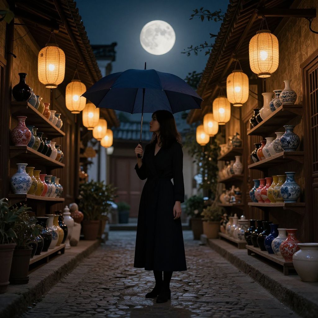 Silhouetted against a luminous full moon, a woman stands gracefully in a quaint courtyard, holding a dark blue umbrella as she gazes outward, surrounded by shelves of colorful pottery and warm, hanging lanterns that illuminate the cobblestone path beneath her.