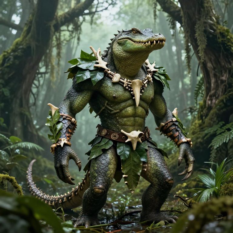Alligator lizardfolk standing in a dense swamp, muscular humanoid body with scaly green skin, sharp teeth, and clawed hands, wearing tribal armor made of bones and leaves, misty background with hanging moss and ancient trees, mystical atmosphere