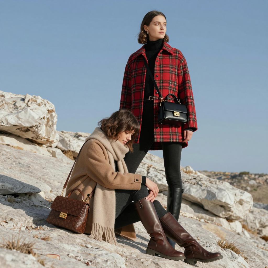 Two women outdoors on rocky terrain. Tall woman in red plaid jacket stands with black handbag, short brown-haired woman sits with beige scarf, brown boots, and handbag, head resting on tall woman's knee. Blue sky, white rock formations. Tall woman looks to the right, short woman looks down.
