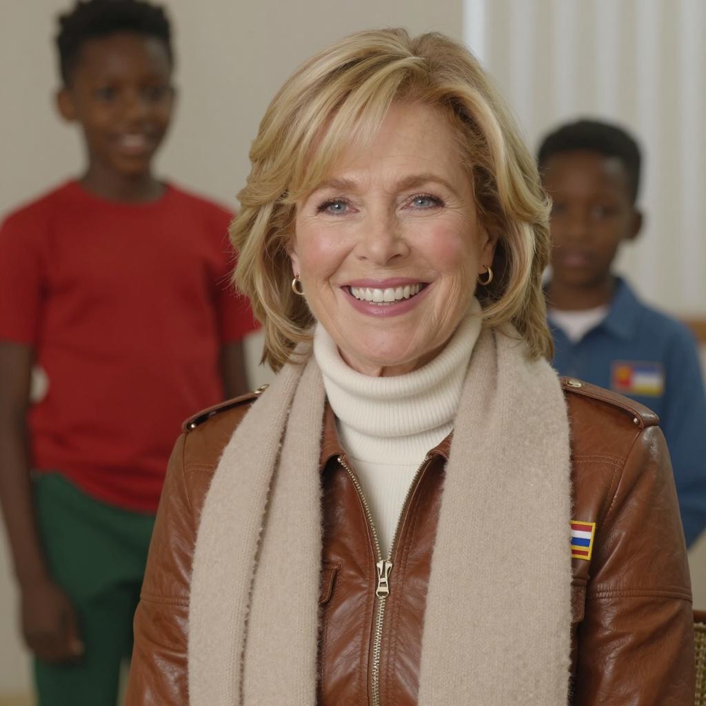 Middle-aged woman with blonde hair and light skin, smiling broadly. She wears a brown leather jacket, white turtleneck, and beige scarf. Background includes two African-American children, one in red shirt and green pants, the other blurred. Indoor setting with vertical blinds. Flag patch on jacket's left shoulder.