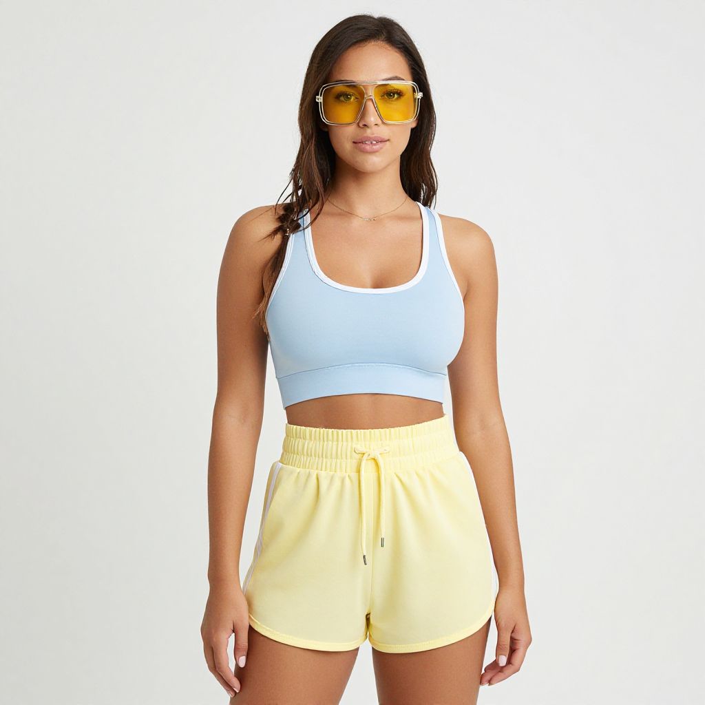 "Woman, sporty casual, color-blocked crop top in pastel shades, scoop neck, racerback design, coordinating high-waisted shorts with drawstring waistband, pale yellow color, above-knee length, white stripe detail, lightweight fabric, oversized sunglasses with yellow tint, long braided hair, minimal jewelry, plain white studio background. Sexy. Pretty face and beаutiful eyes. Big breasts."