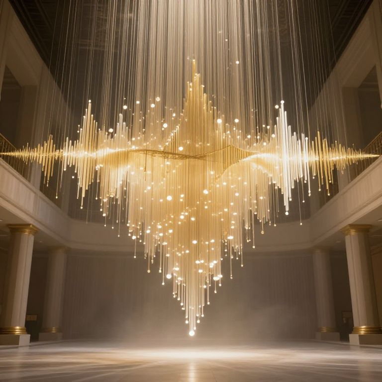 A grand hall bathed in ethereal light is illuminated by a cascading chandelier of suspended sound waves, defying gravity as they shimmer like liquid gold against a misty, otherworldly backdrop.