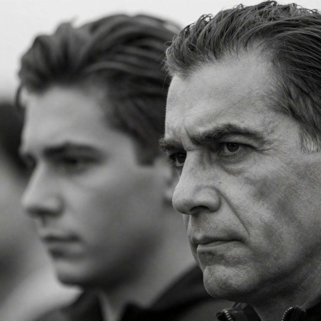 Black and white photograph of two men, close-up. Older man with dark, slicked-back hair, intense expression, on the right. Younger man with similar dark, slicked-back hair, turned slightly away, on the left. Background is blurred. Older man's face is in sharp focus.