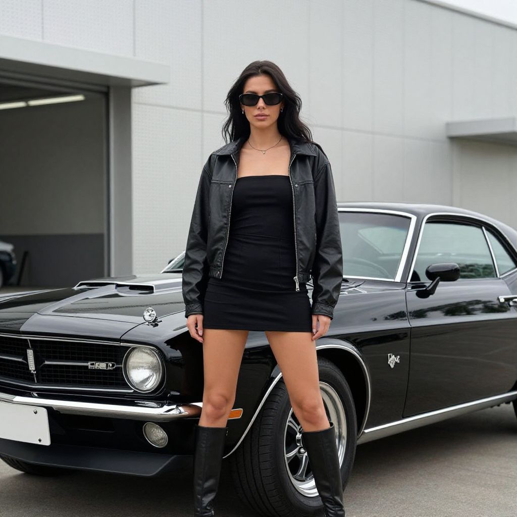 Photograph of a confident woman standing in front of a sleek, black classic muscle car. She's wearing a black strapless dress, black leather jacket, and knee-high boots. Her long dark hair flows over her shoulders, and she's sporting dark sunglasses. The car's shiny, polished surface reflects light, and the background shows a modern, industrial-style building with a textured white wall. The scene exudes a bold, edgy vibe.