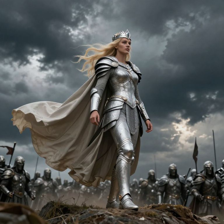Blonde warrior queen commanding an ancient army atop a hill, wearing a silver crown and battle armor, cape fluttering, stormy sky behind her, epic fantasy style with high detail, powerful and regal presence, dramatic lighting and shadows