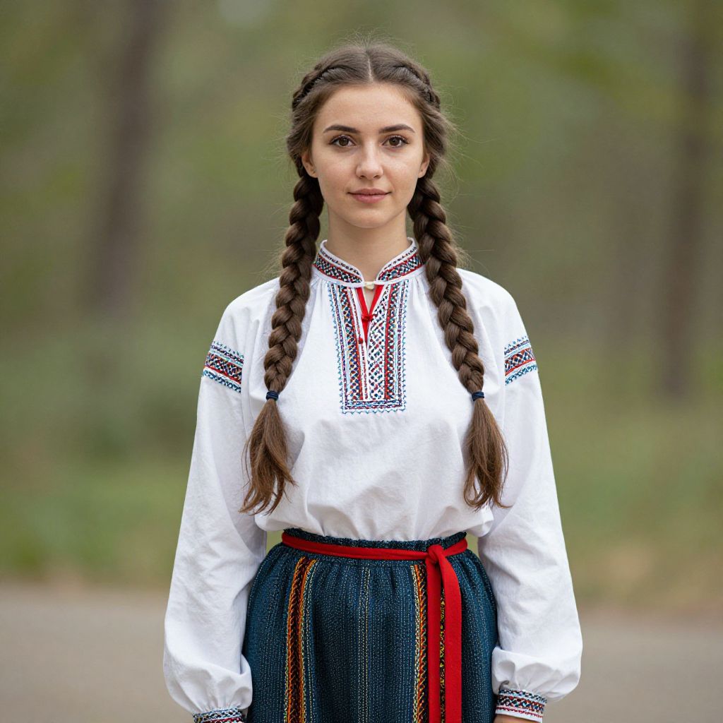 "traditional romanian folk, solo, twin braids, 1girl, braid, skirt, long hair, realistic, brown hair, looking at viewer, long sleeves Realistic photo of casual sexy person with pretty face"