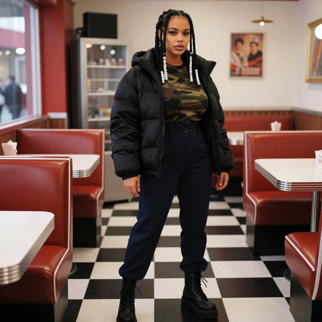 A willowy woman in urban streetwear, oversized black puffer jacket, camouflage T-shirt, and high-waisted navy trousers, stands in a vibrant diner with vinyl seats, embodying the visual style of Audrey Flack. Her chunky black boots and braided hair adorned with clear beads complete the look. Sexy. Pretty face and beаutiful eyes. Big breasts