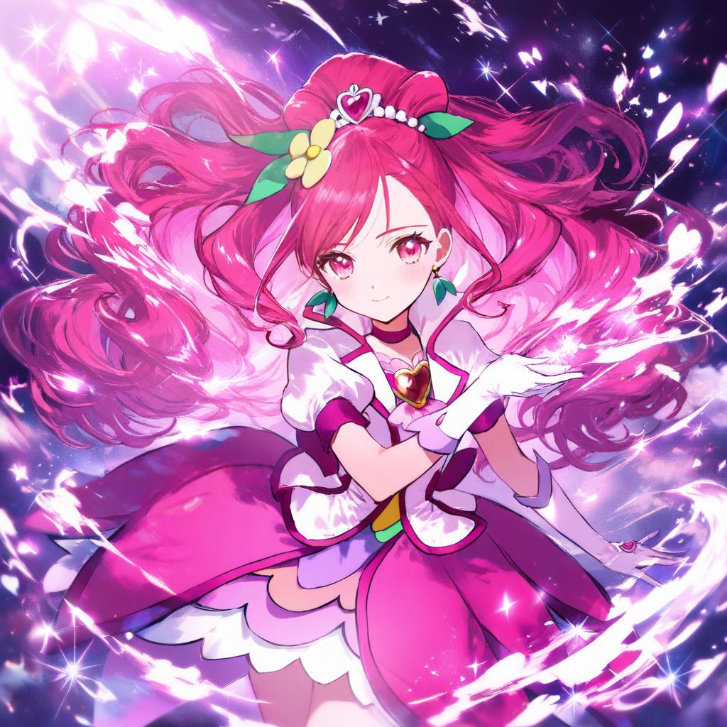 Illustration of Cure Grace, a magical girl character from Healin' Good Precure, featuring long flowing pink hair adorned with a heart-shaped hair ornament and a yellow flower. She wears a pink dress with puffy short sleeves, white gloves, a pink choker, and green leaf earrings. The background is filled with vibrant magical light effects enhancing the dynamic pose.