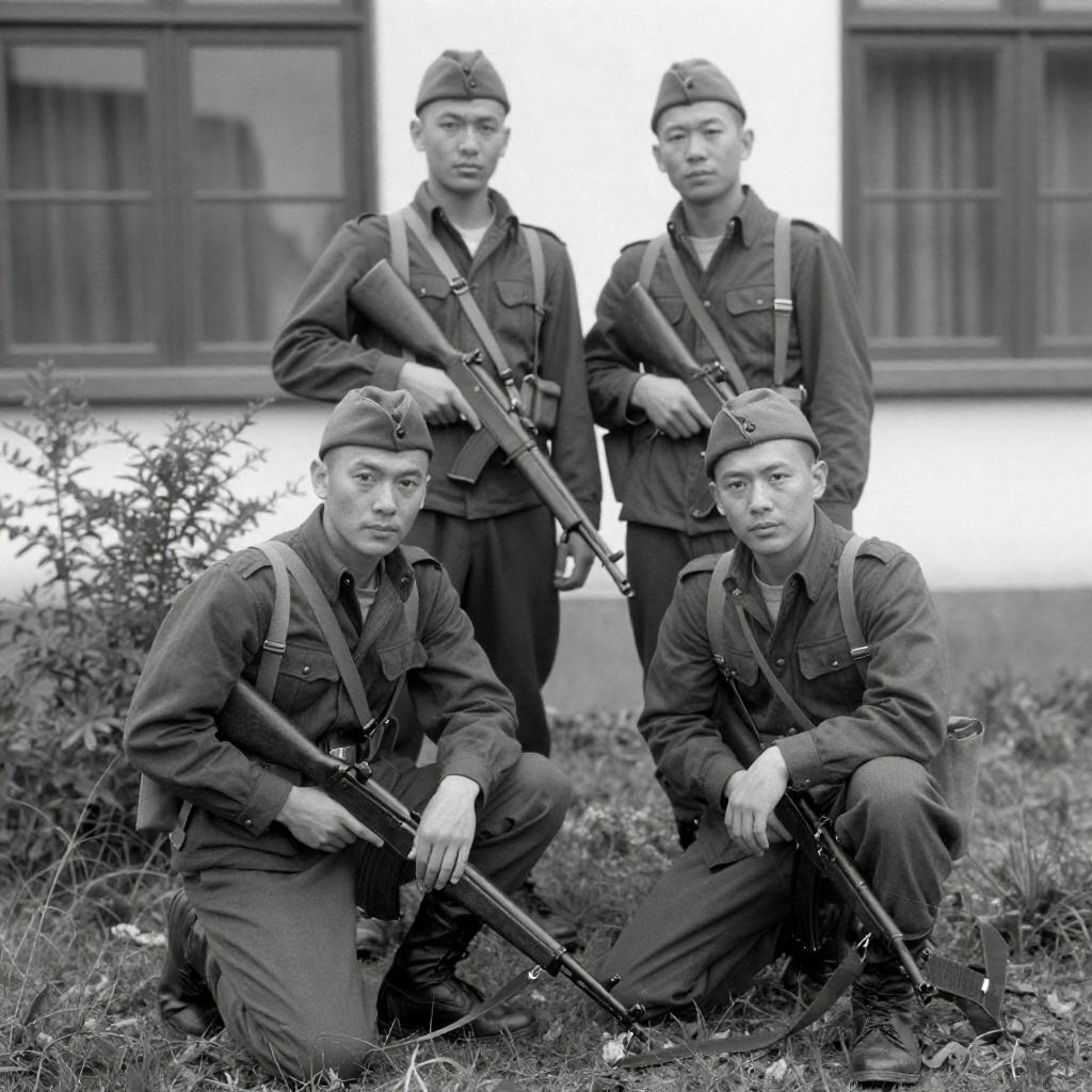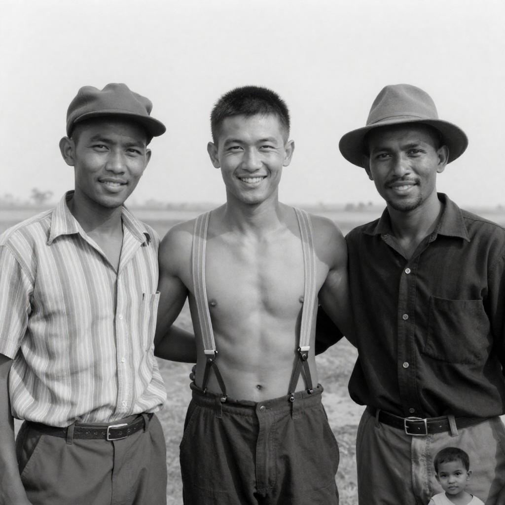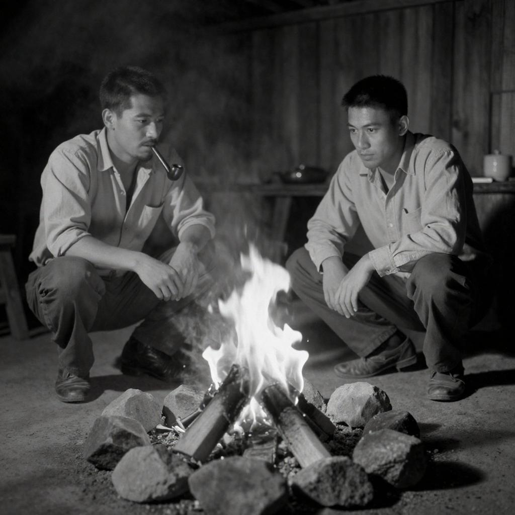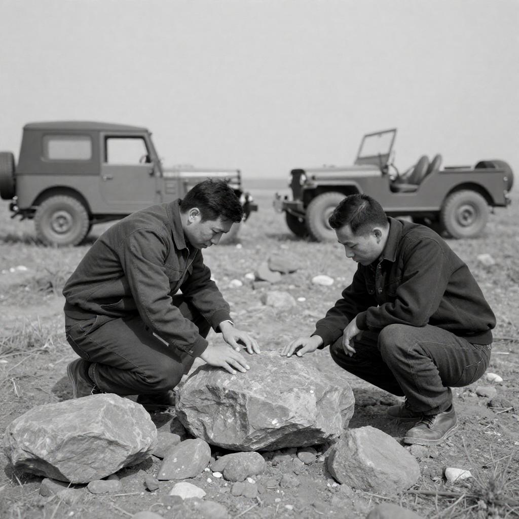 High-Contrast Men Searching Rocky Field