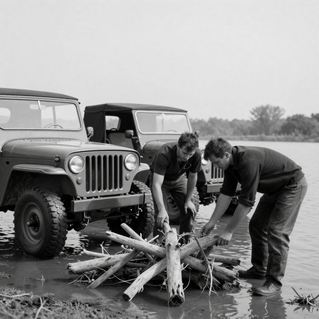 Black-and-white photograph of two men in dark clothing, crouching among large rocks in a desolate field. Two vintage jeeps are parked in the background. The men appear to be searching or inspecting the rocks. The image has a high-contrast, gritty style.