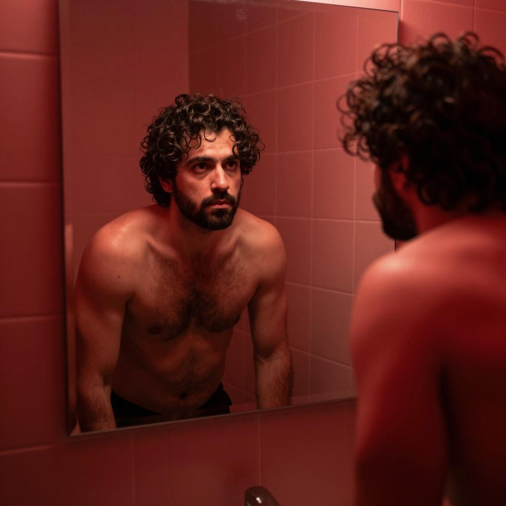 Nude man and woman stand in front of a mirror. Man has short dark hair, muscular build, medium-sized erect penis, uncircumcised. Woman has curly blonde hair, small breasts, touches her mouth with one hand, rests other on man's chest. Lamp on wooden dresser casts warm light. Framed colorful painting on wall. Man and woman embrace, woman's back to viewer. Mirror reflects their upper bodies. Reflections show serious expressions. Beaded mirror frame. Dark, partially visible background. Two people.