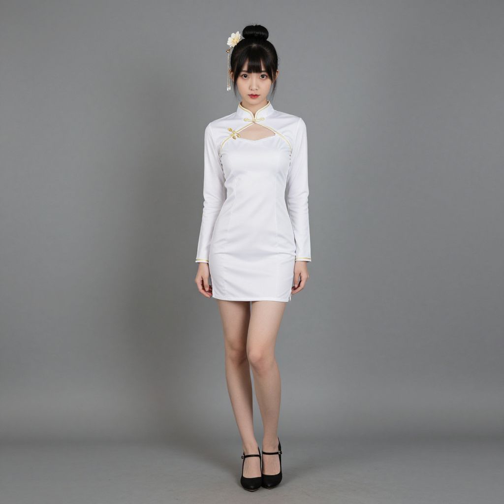 Photograph of an East Asian woman standing against a plain gray background. She has pale skin, black hair in a high bun adorned with a white flower, and red lipstick. She wears a white, long-sleeved, high-neck mini-dress with a keyhole cutout at the chest, accentuating her slim build. Her legs are bare, and she wears black high-heeled shoes. The dress is form-fitting, highlighting her petite frame and small breasts. The overall look is minimalist and elegant, with a modern, chic style. The lighting is even, emphasizing the simplicity of the outfit and the model's features.