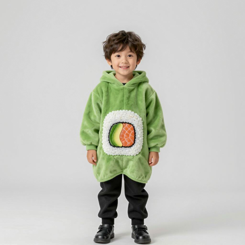 Photograph of a young boy wearing a green fuzzy hoodie designed to resemble a sushi roll, featuring white rice, salmon, and avocado filling details on the front. The boy has short black curly hair, black pants, and black shoes. He is standing and smiling against a plain white background with soft lighting.