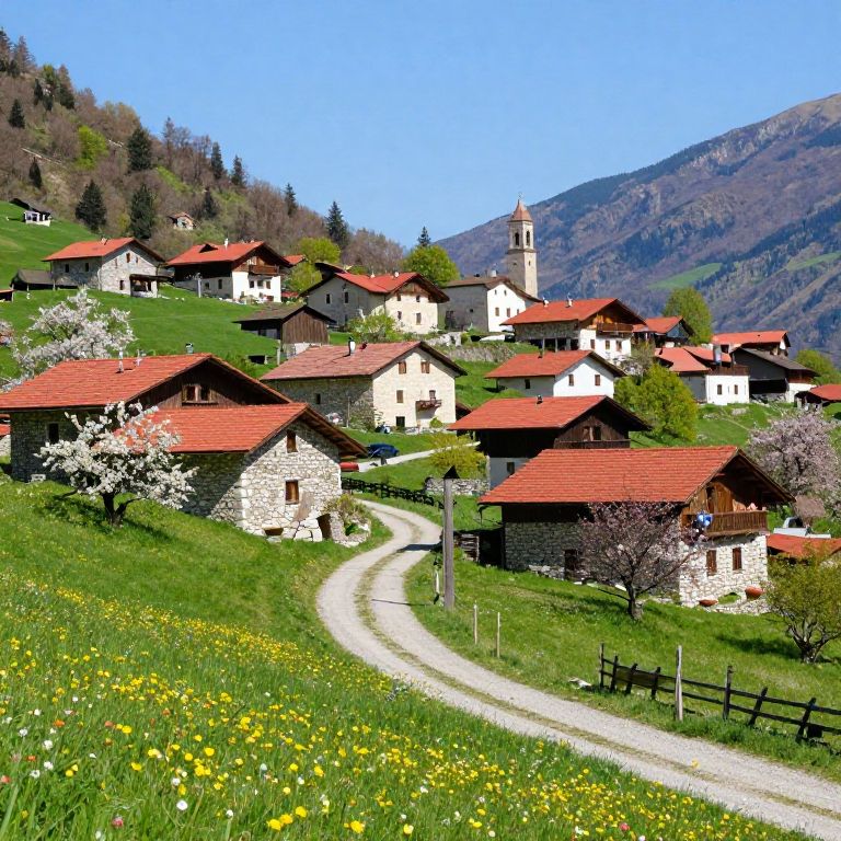 This vibrant photograph showcases a picturesque alpine village with white and gray stone houses featuring red-tiled roofs. A winding gravel path leads through a lush green meadow dotted with yellow wildflowers in the foreground. In the background, a small church with a bell tower stands among the homes, surrounded by gentle, green rolling hills and a distant mountain under a clear blue sky. Blossoming trees add pops of white and pink to the scene. The village is enclosed by wooden fences, and the overall atmosphere is serene and idyllic.