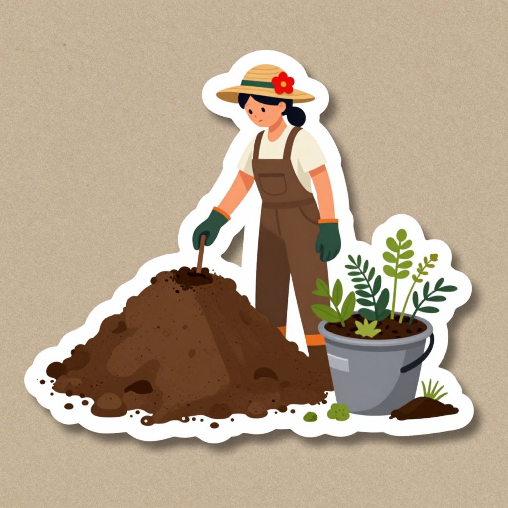 The image depicts a sticker design featuring an adult woman engaged in gardening activities. She is wearing a straw hat adorned with a red flower and overalls, suggesting a practical and earthy aesthetic. The woman is standing next to a large pile of dirt, which is piled high and appears to be freshly dug or prepared for planting. To her right, there is a large bucket filled with various plants and soil, indicating she is in the process of transplanting or caring for them. The scene is set against a textured background, adding depth and context to the image. The overall composition is balanced, with the woman and the bucket of plants being the central focus, while the pile of dirt provides a sense of scale and activity. The colors are warm and earthy, with shades of brown, green, and red dominating the palette, enhancing the natural and organic feel of the scene.