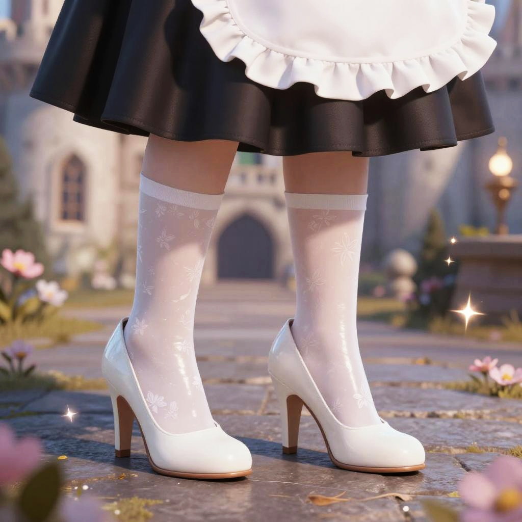 Maid heels, glossy with subtle floral patterns, worn by a maid character in a fantasy castle, surrounded by magical sparks and blooming flowers, high detail, fantasy art style