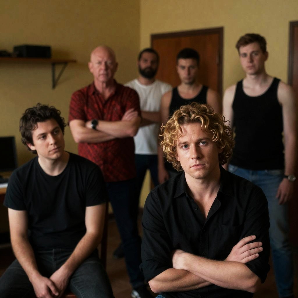 Photograph of a dimly lit urban parking garage. Three men: bearded man in brown jacket and hat leans against pillar, bald man in tan jacket and jeans stands beside him, young man with gray hoodie stands to the right. Red delivery box and motorcycle in background. Pillars with red bricks, checkered floor. Bearded man looks serious, bald man looks intense, young man looks cautious.