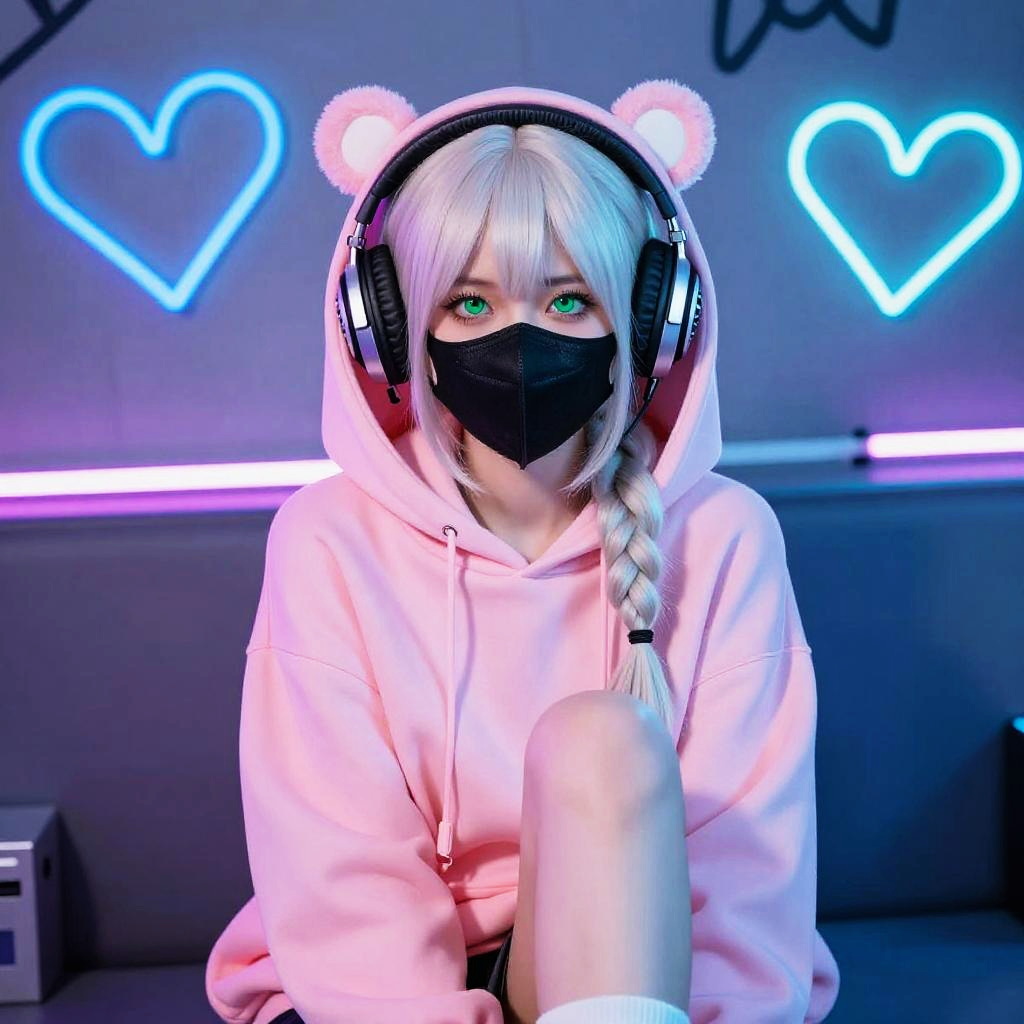 A young woman with green eyes and platinum blonde hair styled in a braid wearing a pink bear-eared hoodie, black mask, and large headphones, sitting with one knee up in a neon-lit room featuring glowing blue heart graffiti on the wall, cyberpunk style, vibrant pink and cyan color lighting, futuristic atmosphere