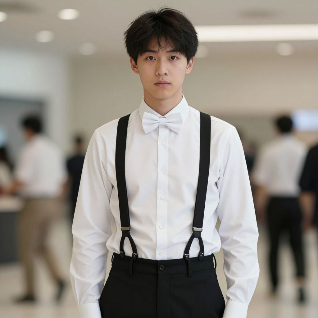 "charleston costume, 1boy, male focus, solo, shirt, suspenders, realistic, white shirt, white bow, blurry background, pants, blurry, black pants, bow, indoors, bowtie, looking at viewer, white bowtie, black hair, asian, closed mouth, belt Realistic photo of casual sexy person with pretty face"