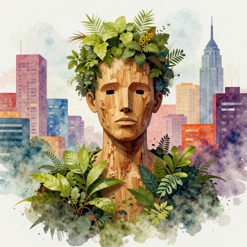 Wooden Man with Foliage in Vibrant Cityscape