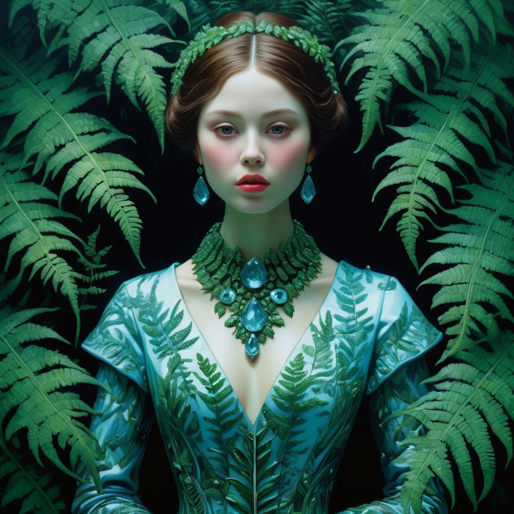 Epic portrait of a young beautiful contemporary lady covered in green ferns, in a lush fern garden, wearing highly detailed contrasting gown and aquamarine jewelry. Oil on canvas style by Yayoi Kusama and Brian Froud, baroque romanticism, chiaroscuro lighting, hyper-realistic skin detail.