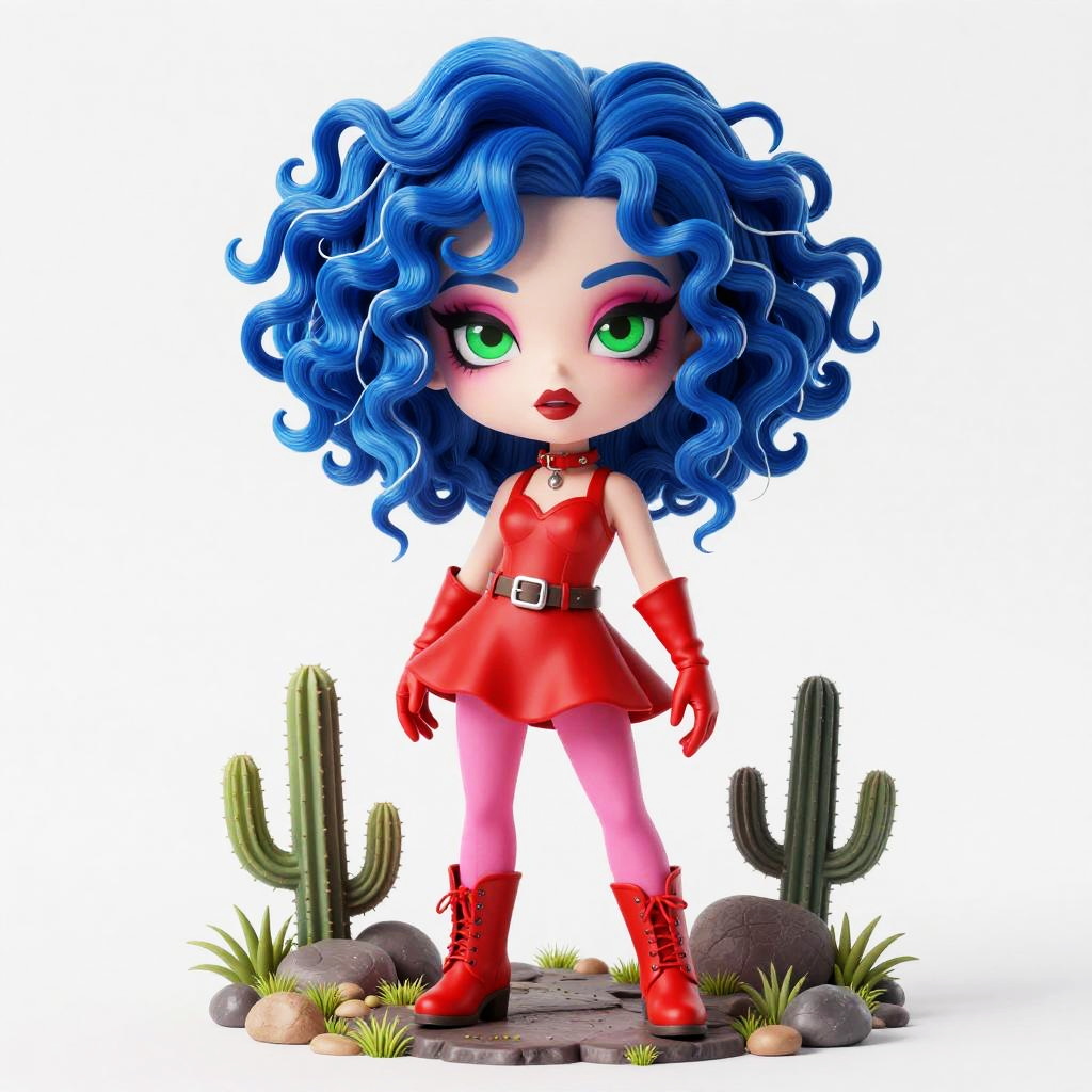 This is a digital chibi-style illustration of a stylized female character with large, expressive green eyes and vibrant blue, wavy hair. She wears a tight, red, sleeveless dress with a belt, red gloves, and matching red boots. Her skin is pale, and she has a small, button nose and full red lips. She stands confidently in a desert-like setting with two cacti and small rocks in the foreground, surrounded by sparse grass. The background is pure white, making the character and desert elements stand out vividly. The overall style is colorful, cartoonish, and exaggerated.