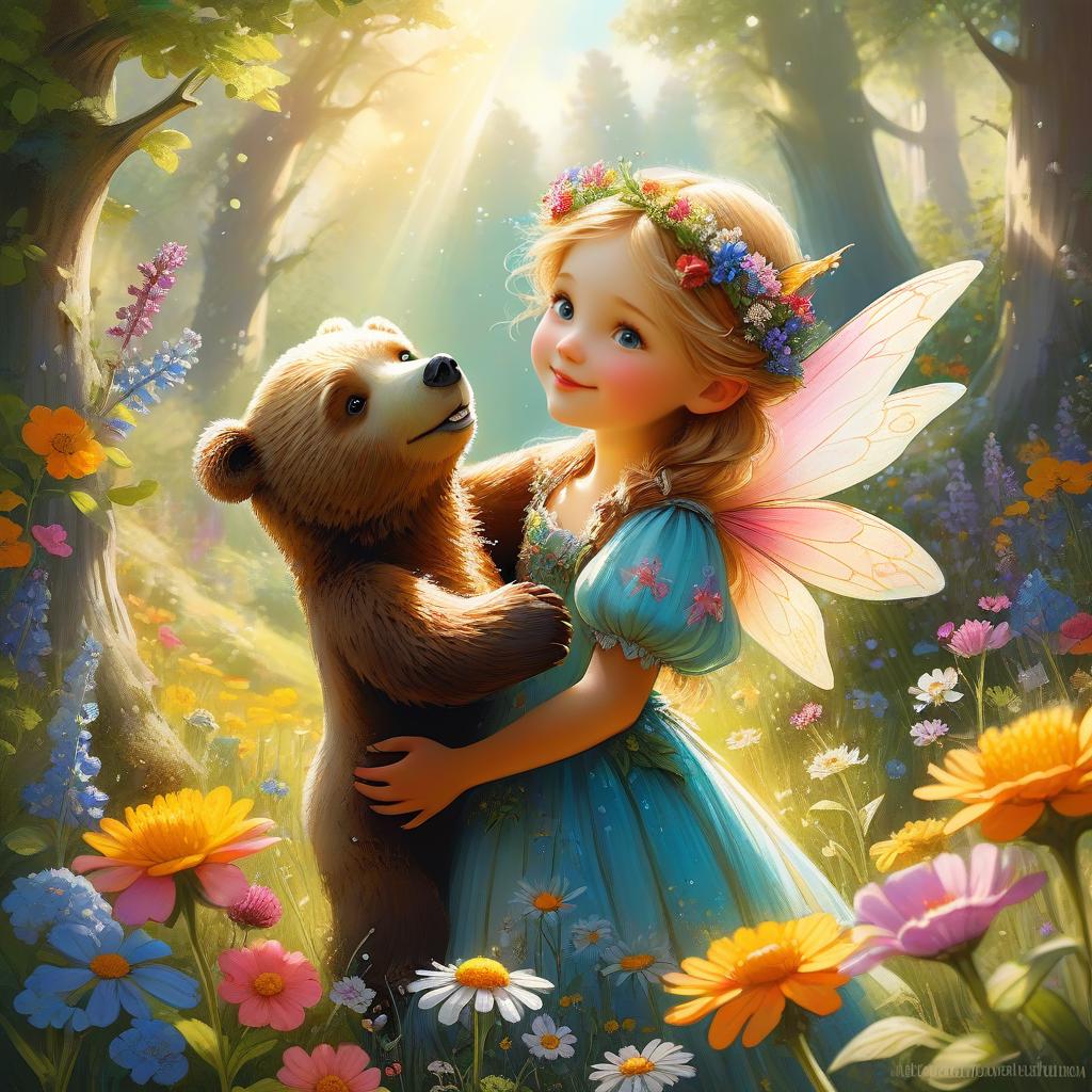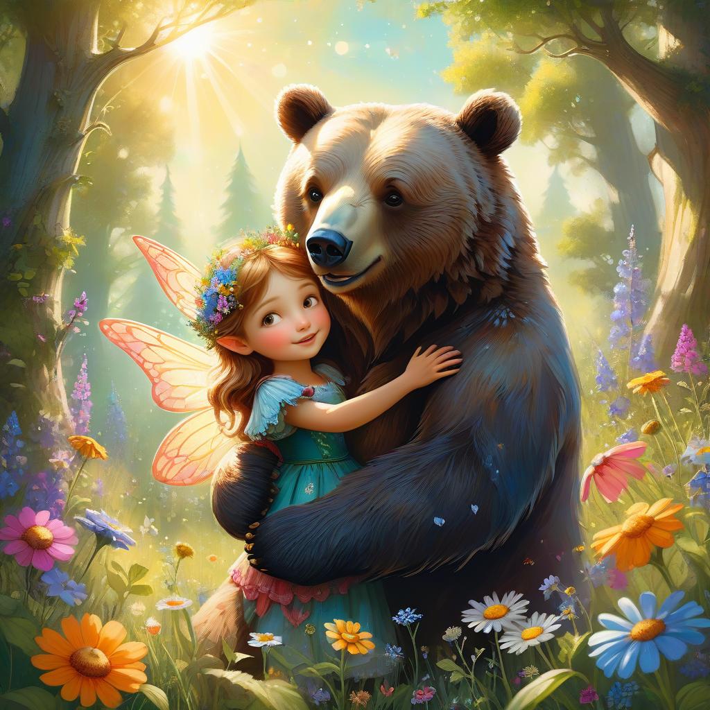 A lovely fairy being held by a friendly bear, in a sunlit glade, painted in cheerful, highly detailed children’s illustration, featuring bright expressions and blooming wildflowers