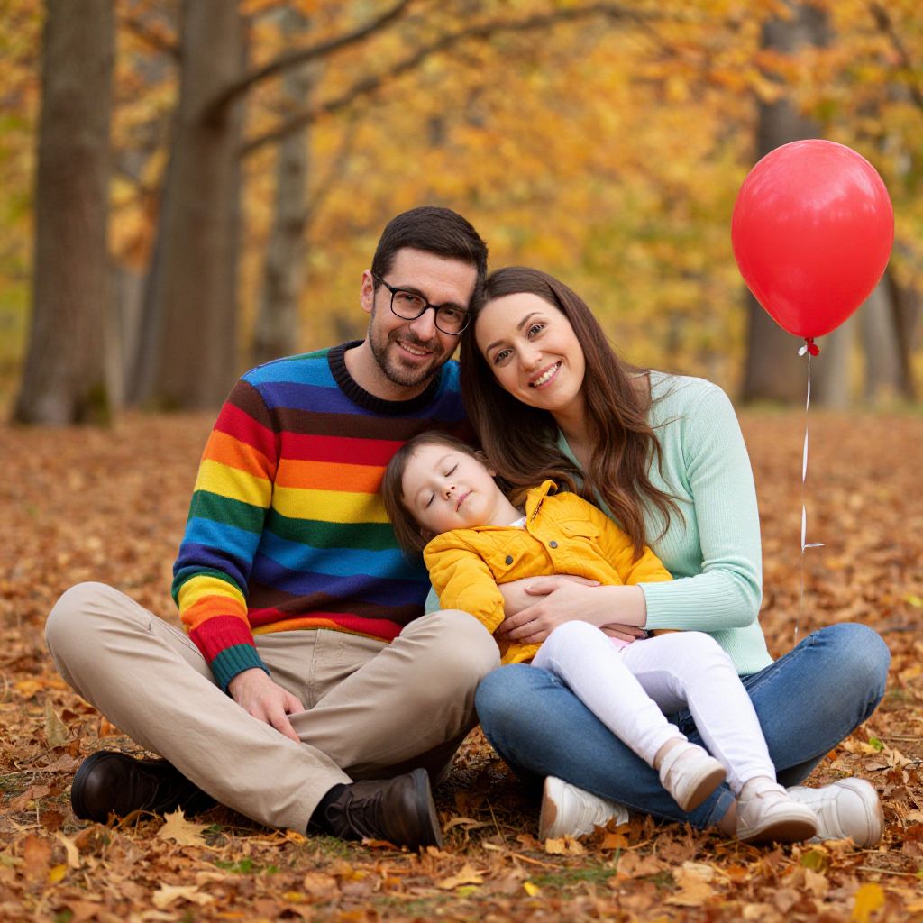 A colorful, digital photograph of a happy family of three sitting on an autumnal forest floor. The dad, with dark hair and glasses, wears a rainbow-striped sweater and beige pants. The mom, with long brown hair, is in a light green top and jeans. They're cuddling a cute, sleepy child in a yellow jacket and white pants. Orange leaves and a red balloon add to the warm, cozy vibe.