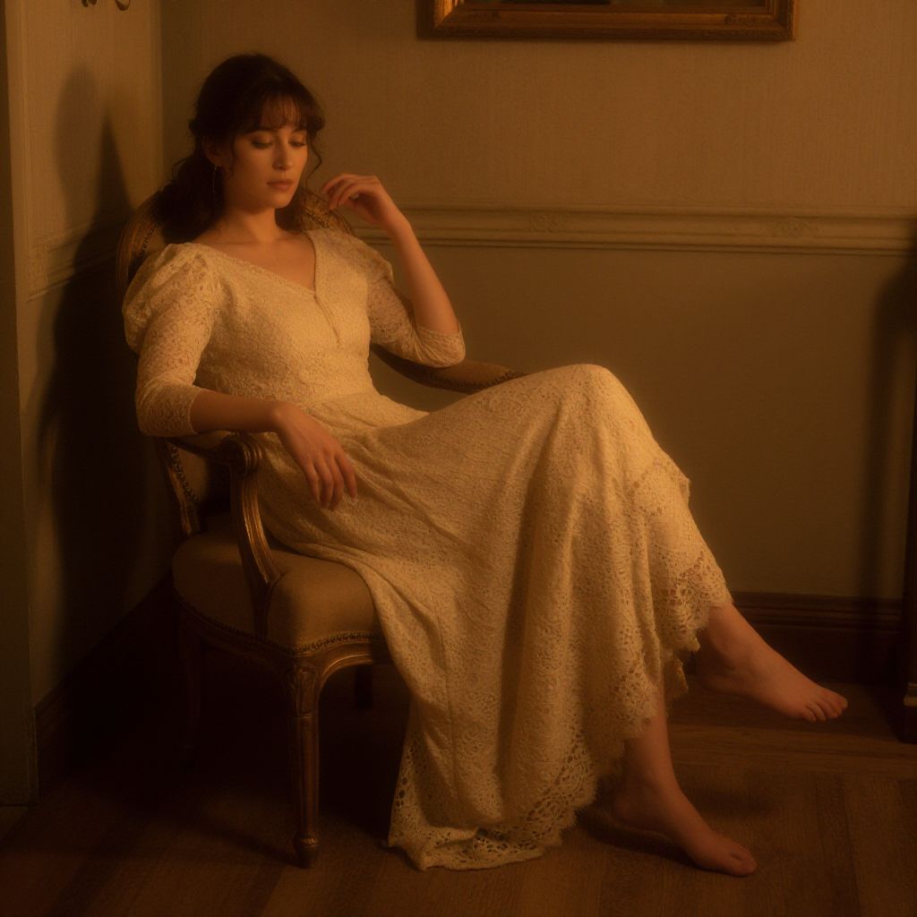 Woman full body beautiful, sitting gracefully on a vintage chair in a classic Victorian room, wearing a detailed lace dress, warm ambient lighting, soft textures and delicate patterns, atmospheric and moody