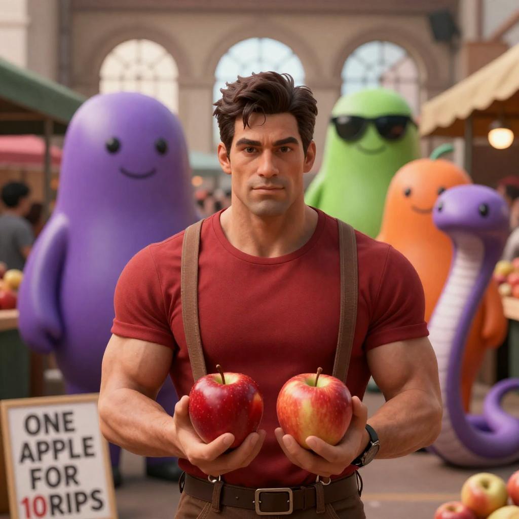 CGI image of a muscular man with dark hair, red shirt, and brown suspenders holding two red apples. Beside him, a purple blob, a green creature with sunglasses, an orange creature, and a purple snake-like character. Background shows a busy market with arched windows and a crowd. Sign in front reads "ONE APPLE FOR 100 GRIPS."