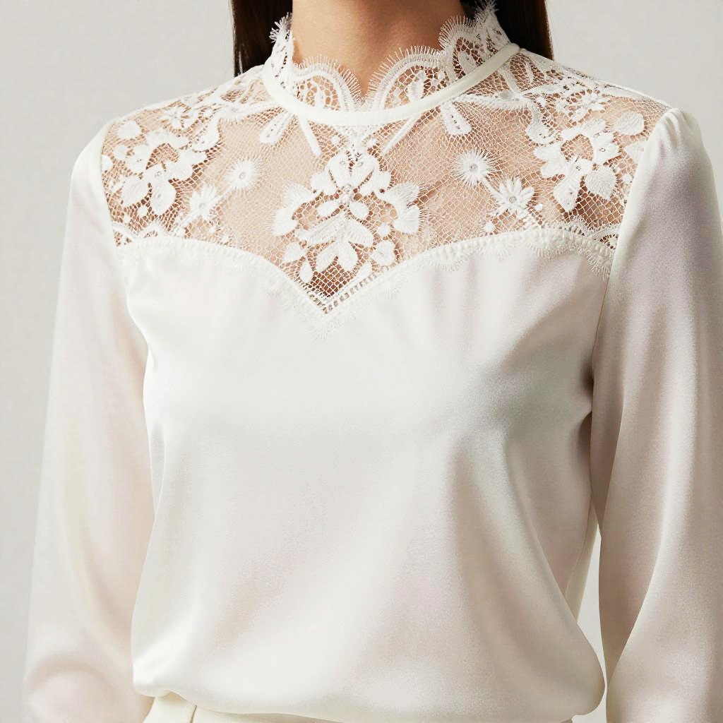 Silky white blouse with intricate lace details, close-up shot highlighting texture and smoothness, subtle shadows, modern studio setting, sophisticated and chic vibe