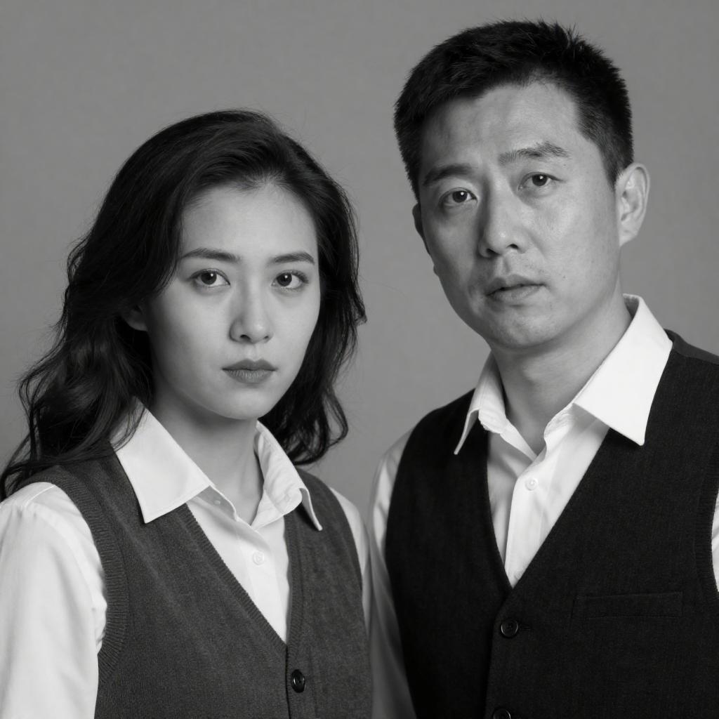 Black-and-white photograph of a man and woman in a dramatic pose. The woman, with short dark hair and a white blouse with a dark sleeve, smiles slightly while holding a small object. The man, with short dark hair and a mustache, looks surprised, wearing a light-colored shirt. They are close, facing each other, with a dark background.