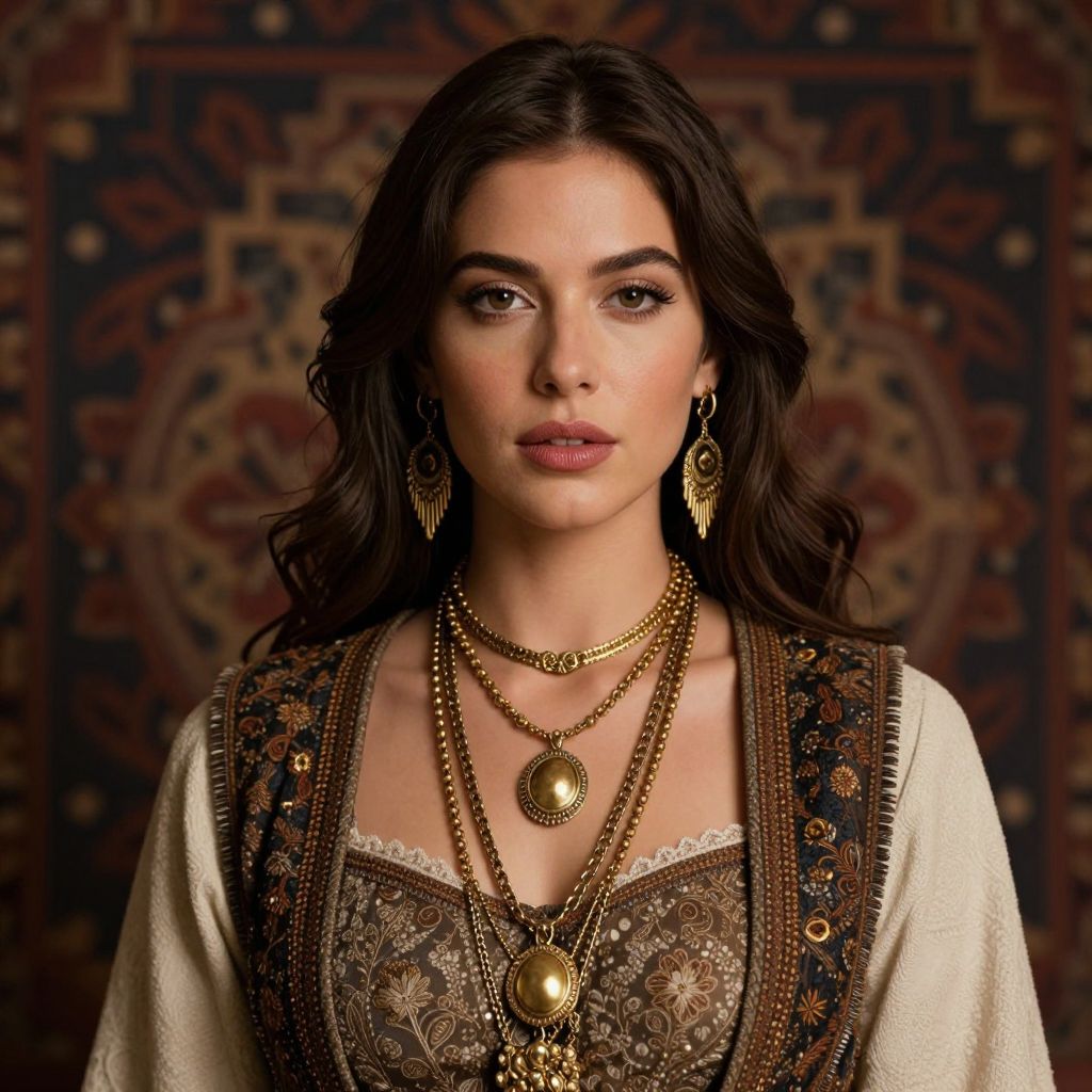 Photograph of a young woman with medium-dark skin and long, wavy black hair, wearing traditional Middle Eastern attire. She has dark eyebrows, full lips, and is looking directly at the camera with a neutral expression. She wears a cream-colored blouse with a brown, embroidered vest adorned with intricate patterns. Her jewelry includes large, gold, teardrop-shaped earrings, multiple layered gold necklaces with circular and oval pendants, and a gold brooch at the center of her chest. The background features a richly patterned, dark blue and red carpet. The lighting is soft, highlighting her facial features and the textures of her clothing and jewelry.