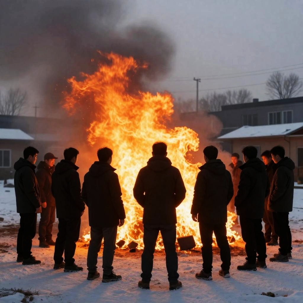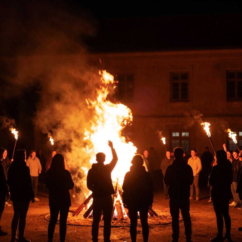 Photograph of a nighttime bonfire in front of a stone building. Multiple tall torches with bright flames surround the scene. Silhouetted people, some with raised arms, stand in the foreground and background. Flames illuminate faces and building. Dense smoke rises from the fire. Number of people: around 20. Intense expressions visible on some faces.