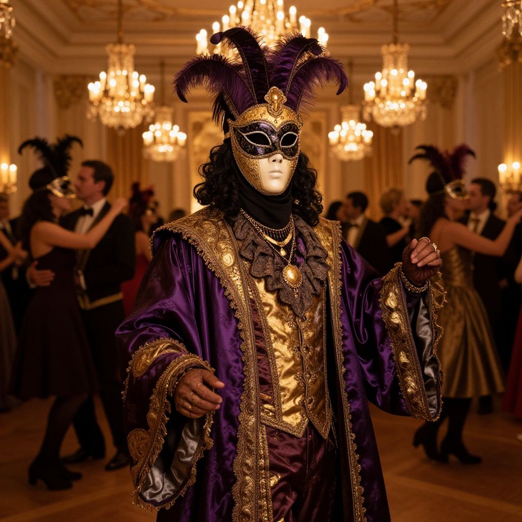 A theatrical Cornelius Rudolph costume featuring an elaborate mask, layered silk robes in deep purples and golds, and ornate jewelry, set on an elegant masquerade ball with chandeliers and masked guests dancing in the background.
