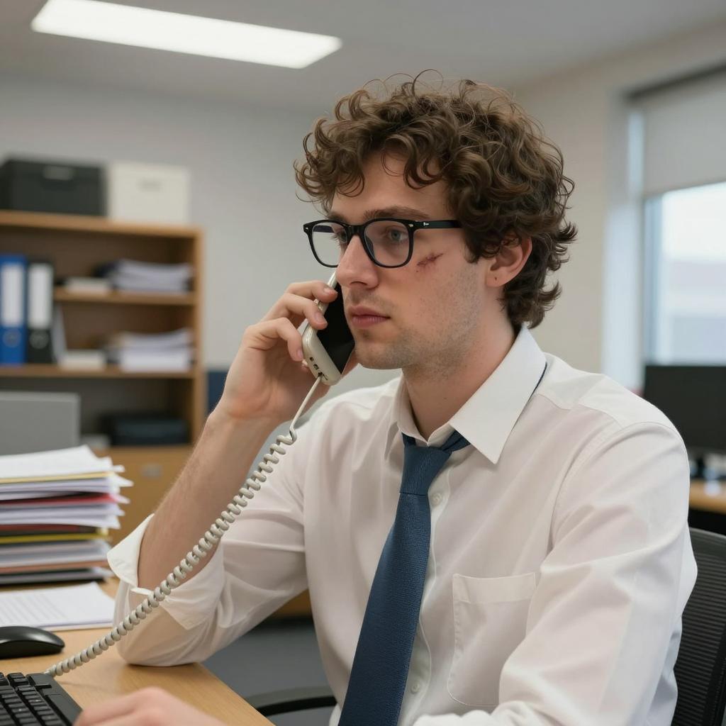 Professional office setting with a bald man in a blue suit and brown tie seated, attentively listening to a standing colleague with curly brown hair wearing a cream shirt and brown pants, who is on the phone and holding a white cloth. Five diverse women in business attire stand in the background observing the interaction. The office environment includes cubicles, fluorescent lighting, desks, and office chairs.