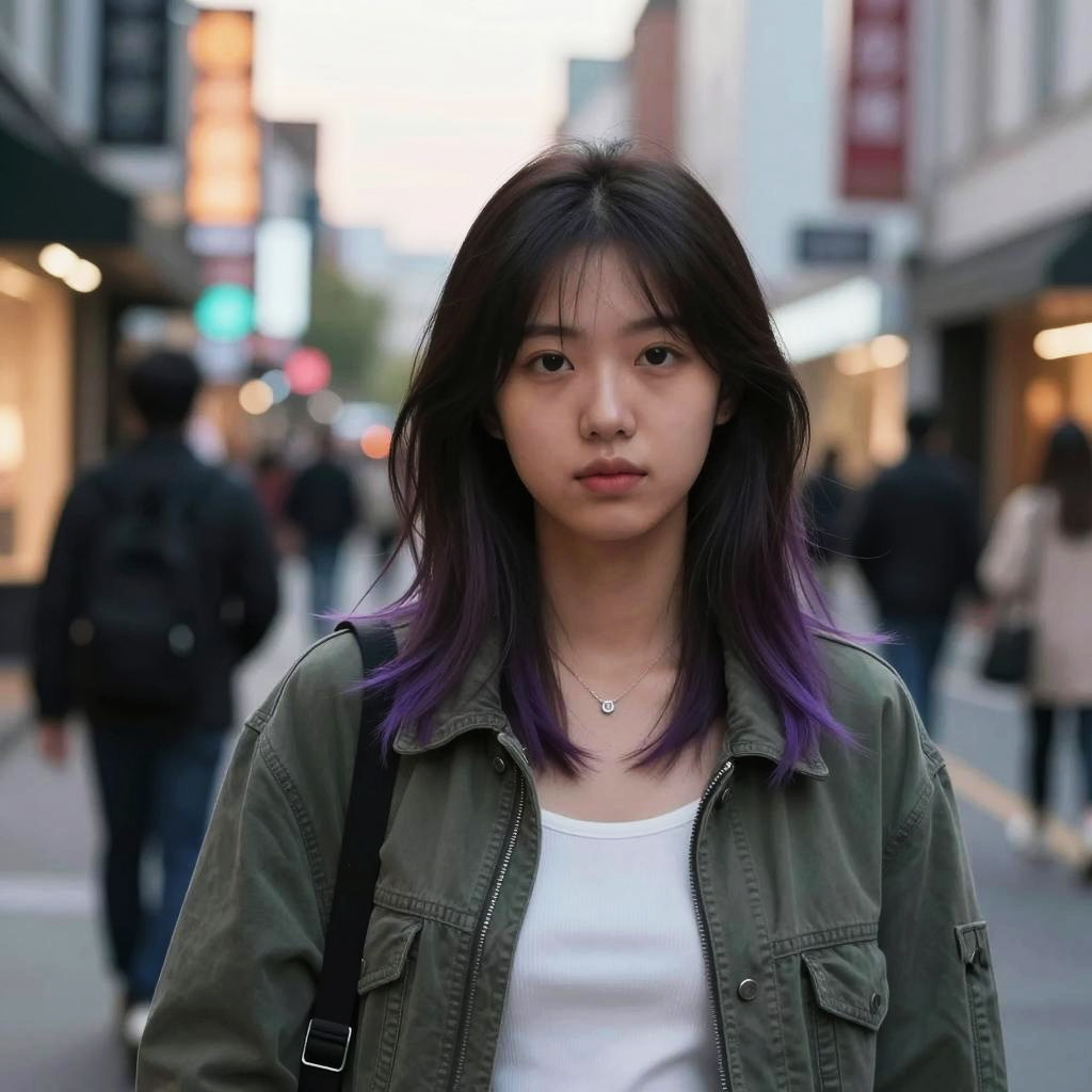 A young woman with shoulder-length dark hair dyed with subtle purple highlights stands in an urban street setting during twilight. She wears a casual green jacket and a white top, with a delicate necklace, as blurred pedestrians and warmly lit shop signs create a vibrant city atmosphere in the background.