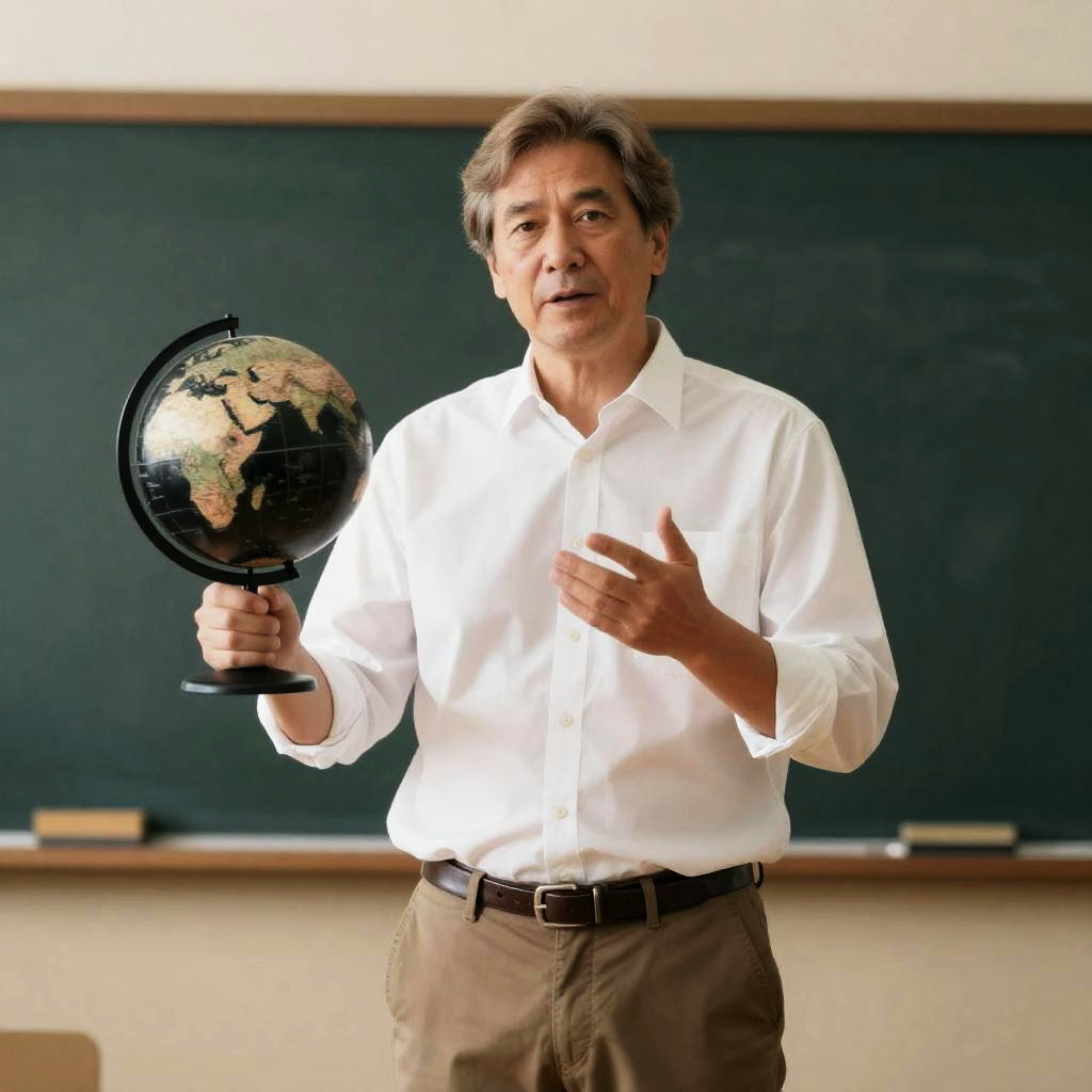 Middle-aged man with light brown hair, wearing a white dress shirt and brown pants, stands in front of a chalkboard. He holds a black globe in his right hand, gesturing with his left. Wooden paneling is in the background.