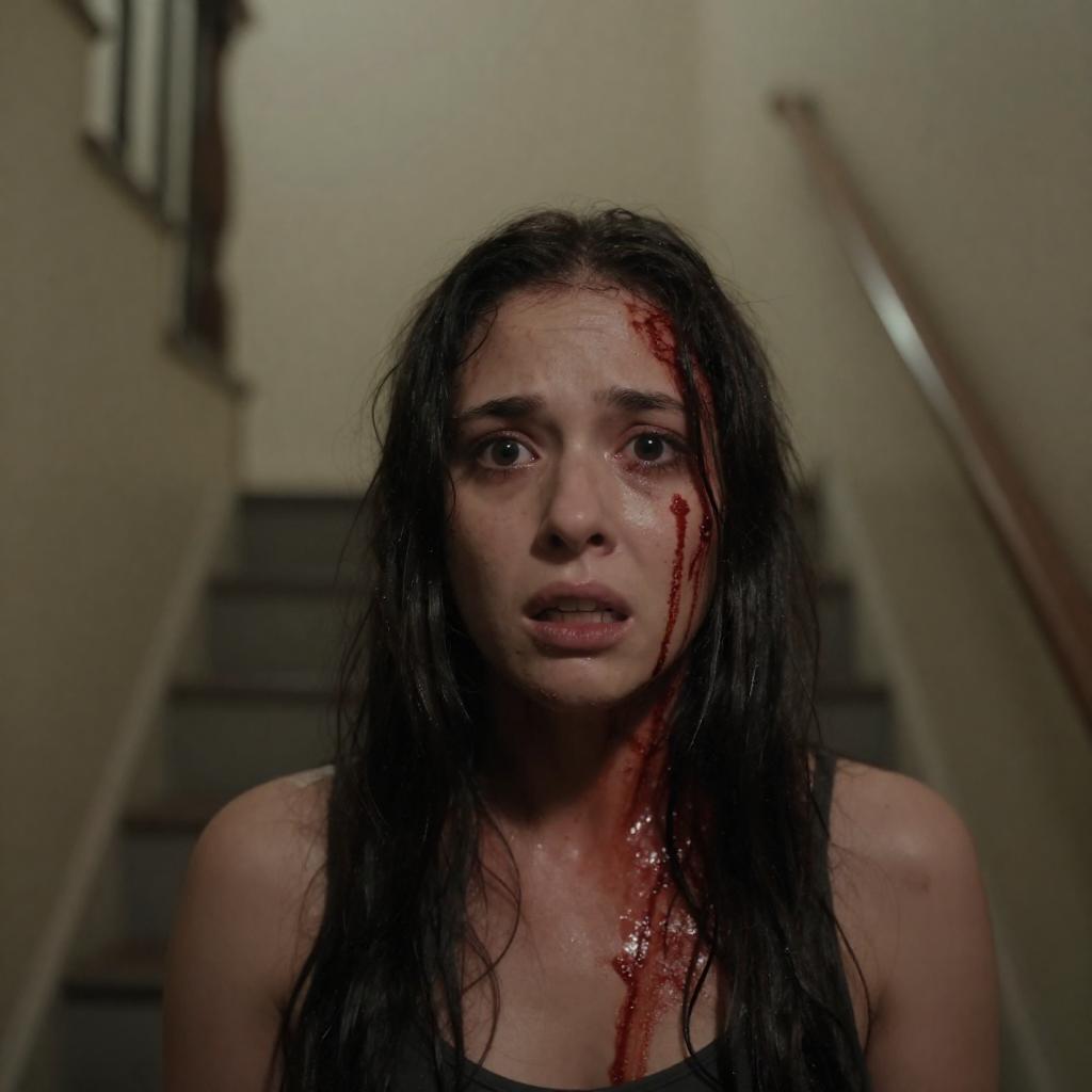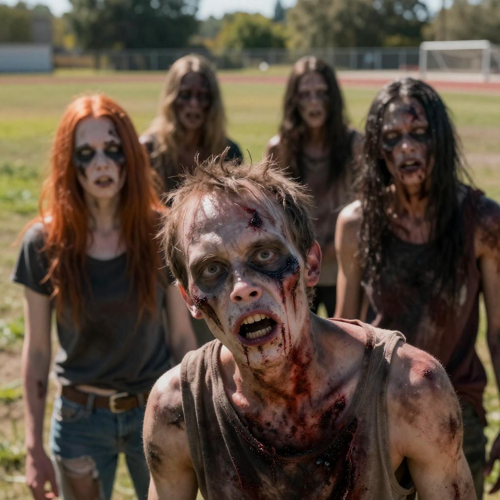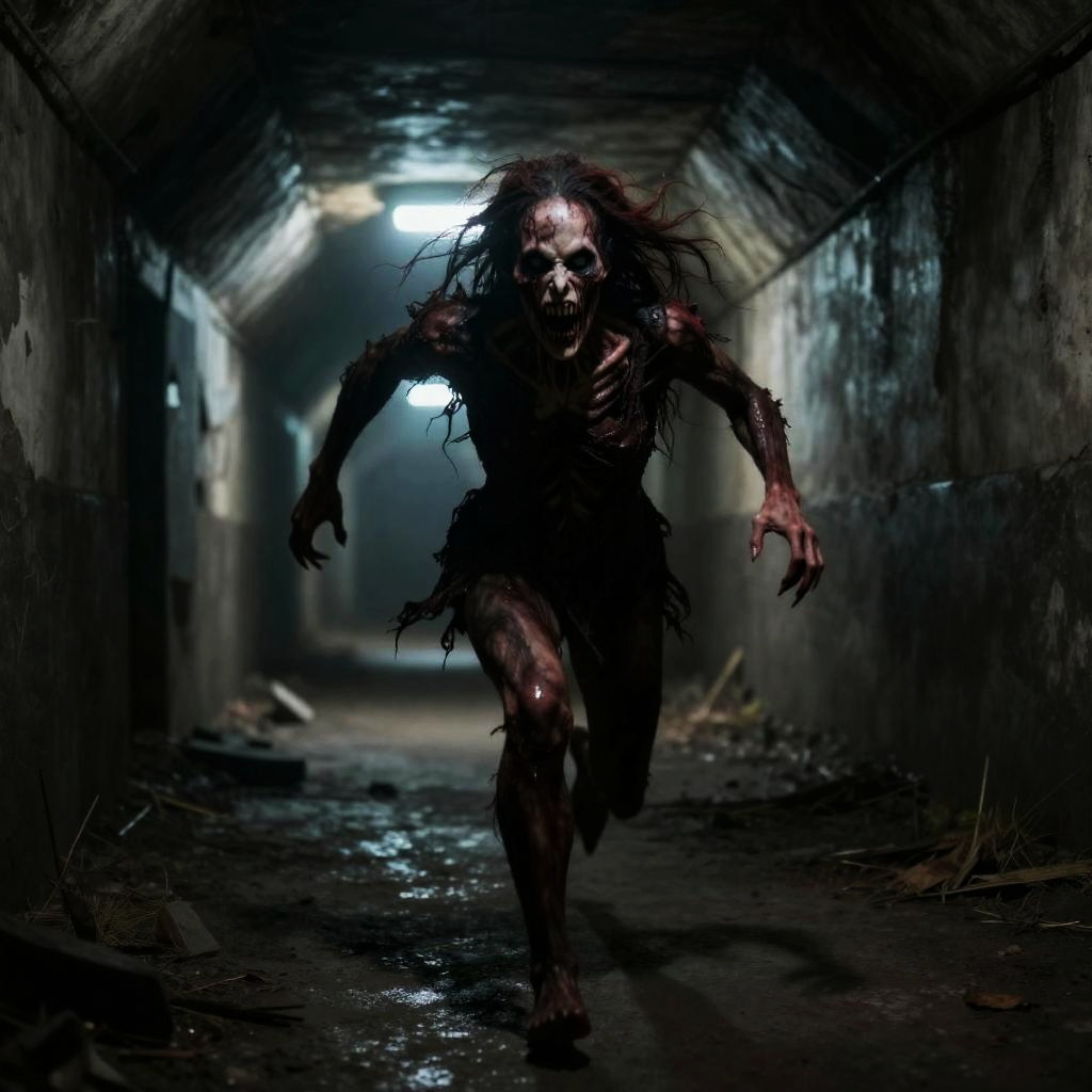 Zombie woman with bloody clothes, exposed skin, and torn white shirt stands in a dark, wooden, dilapidated room. Two people with long hair in foreground, one in blue dress, one in dark clothing. Wooden floor, chair, and framed picture in background. Zombie's mouth open, eyes vacant. Wooden door behind zombie, slightly ajar. Debris on floor. Foreground people's hands raised, expressive.