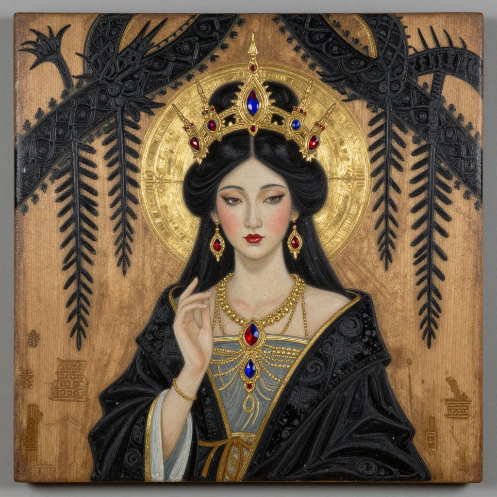 \"\"\"\"\"\"\"Crown of Glory Radiant Woman with Black Dragon Wisteria\"\"\"\" painting of a beautiful woman made with encaustic wax,pigment on wood.\"\"\