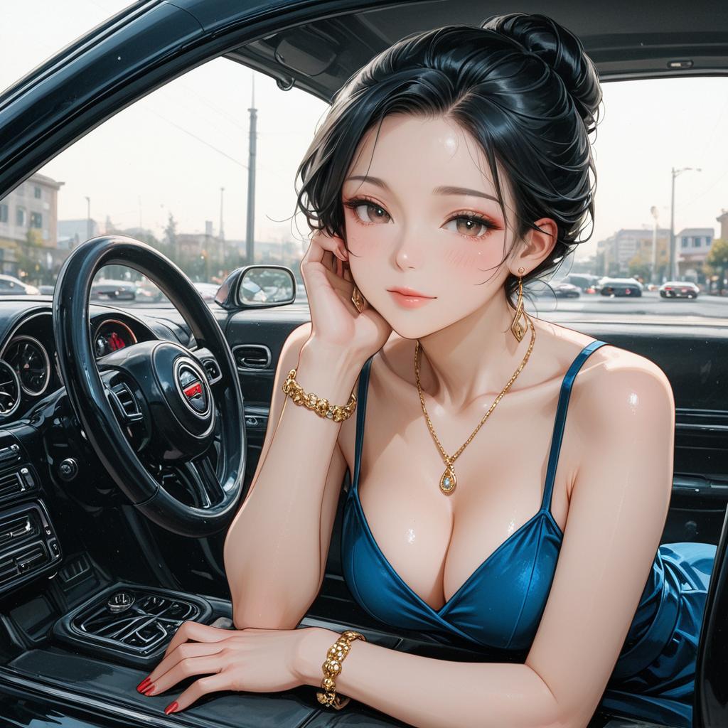 1girl, jewelry, dress, car, breasts, motor vehicle, cleavage, necklace, earrings, solo, blue dress, medium breasts, bracelet, black hair, looking at viewer, hair bun, makeup, single hair bun, sleeveless, black eyes, red lips, sleeveless dress, smile, traditional media, lipstick
