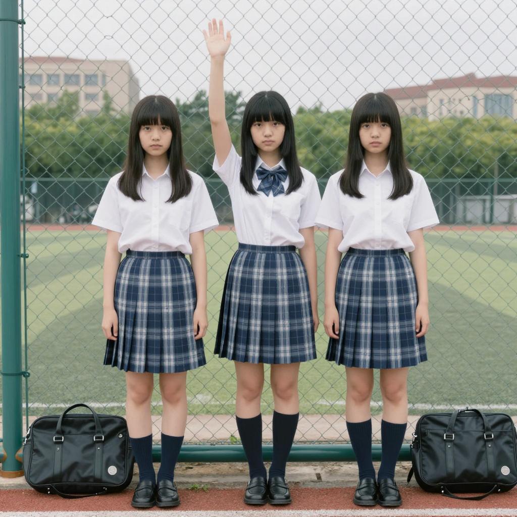 Black and white photo of four young women standing on a grass baseball field. They are wearing matching light-colored dresses with dark belts, knee-high socks, Adidas sneakers, and baseball caps. Three women hold baseballs and raise one arm, while one woman stands with her hands on her hips. They are smiling with a joyful expression. Background shows blurred trees, baseball field fence, and signage advertisements.