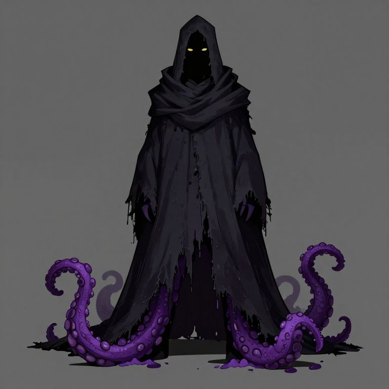 Mysterious dark hooded figure with glowing yellow eyes, draped in tattered black cloak, standing on purple tentacles, digital art.