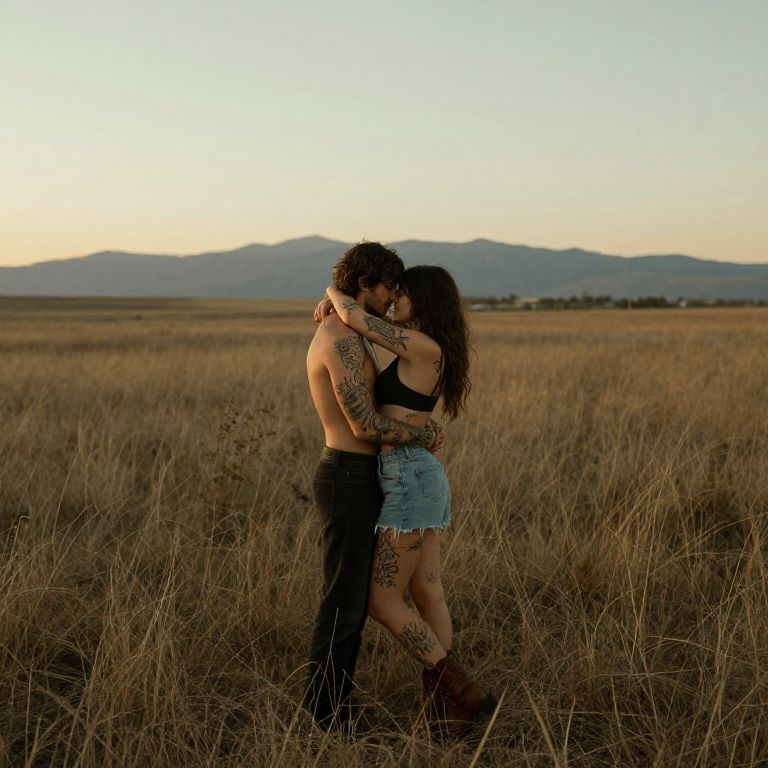 In a vast, open expanse where earth meets sky, two souls embrace the raw beauty of love, their bodies adorned with tattoos that tell stories of freedom and rebellion, while the gentle rustle of dry grass and the distant whisper of mountains echo the timeless rhythm of their union.